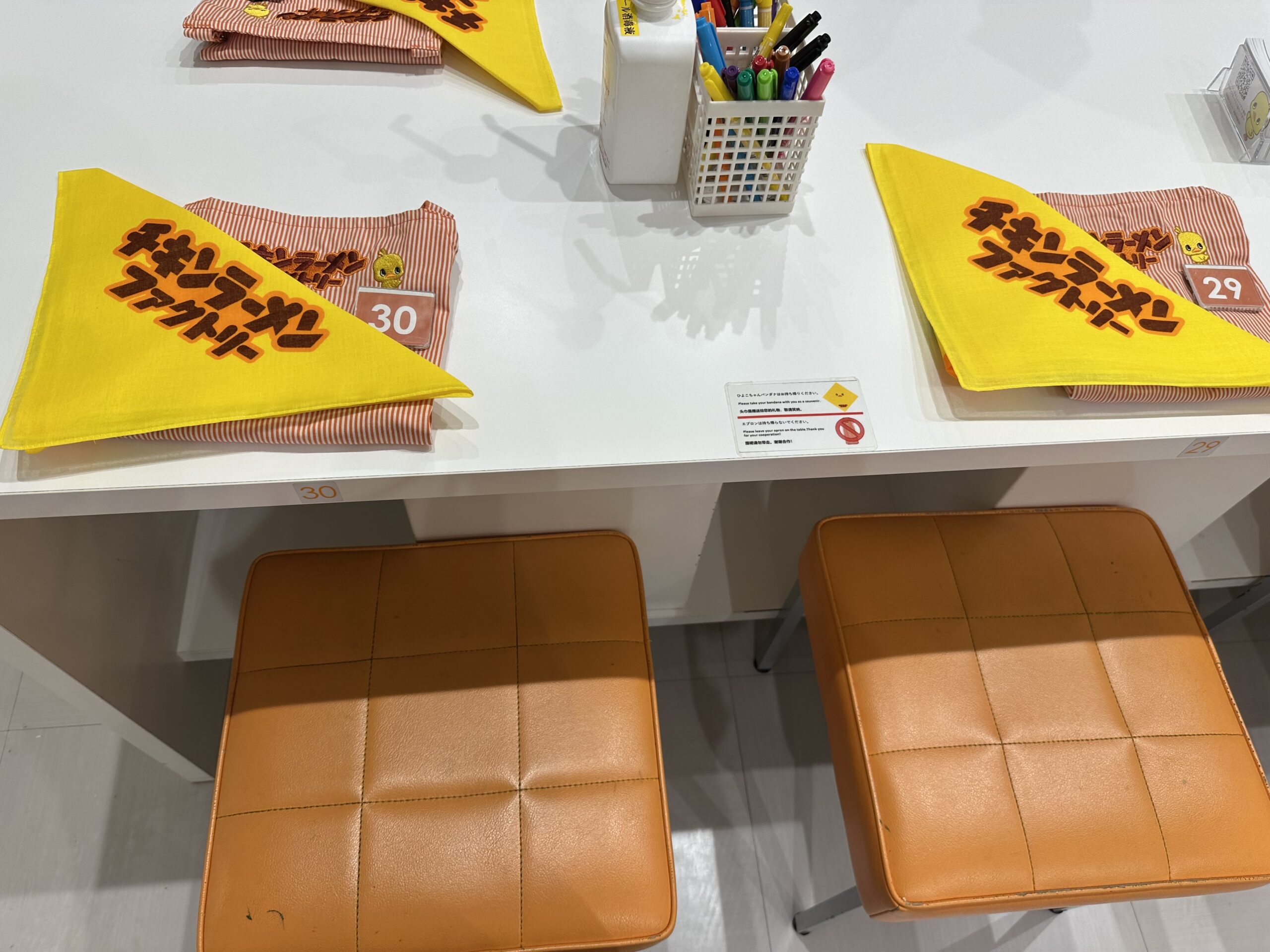 ひよこちゃんのバンダナはお持ち帰りできます!エプロンは貸し出しです。