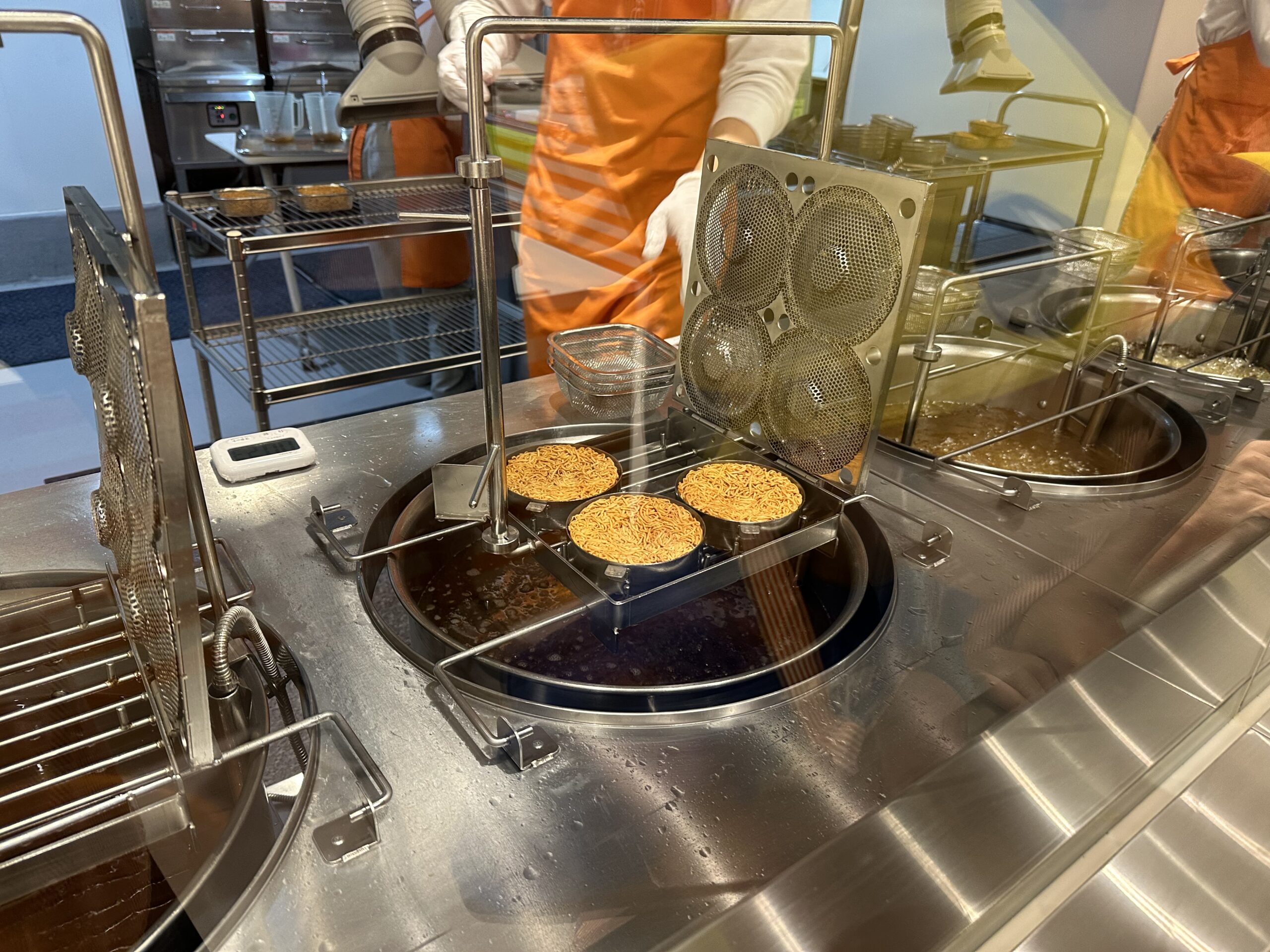 チキンラーメンを作る作業台では写真撮影は禁止ですが、ラーメンを揚げるときだけ撮影可能です。ちゃんと番号で管理されていて、自分の麺の番になるとスタッフさんが教えてくれました。