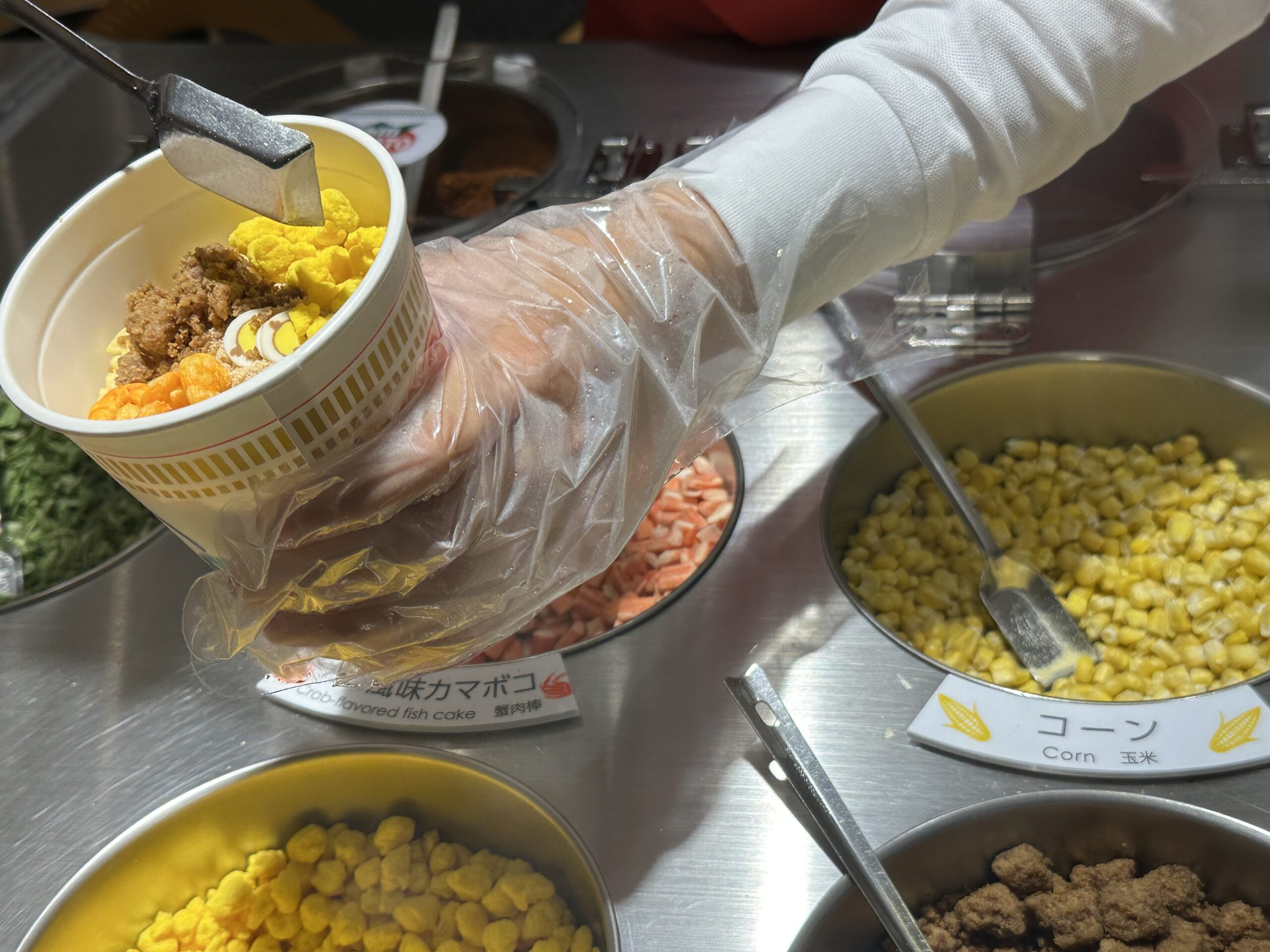 時間制の入場にはなっていますが、かなりの人数を受け入れているようで、私たちが行った日は、30分くらい行列に並んで、ようやく具材などを選択できるカウンターに着きました。
