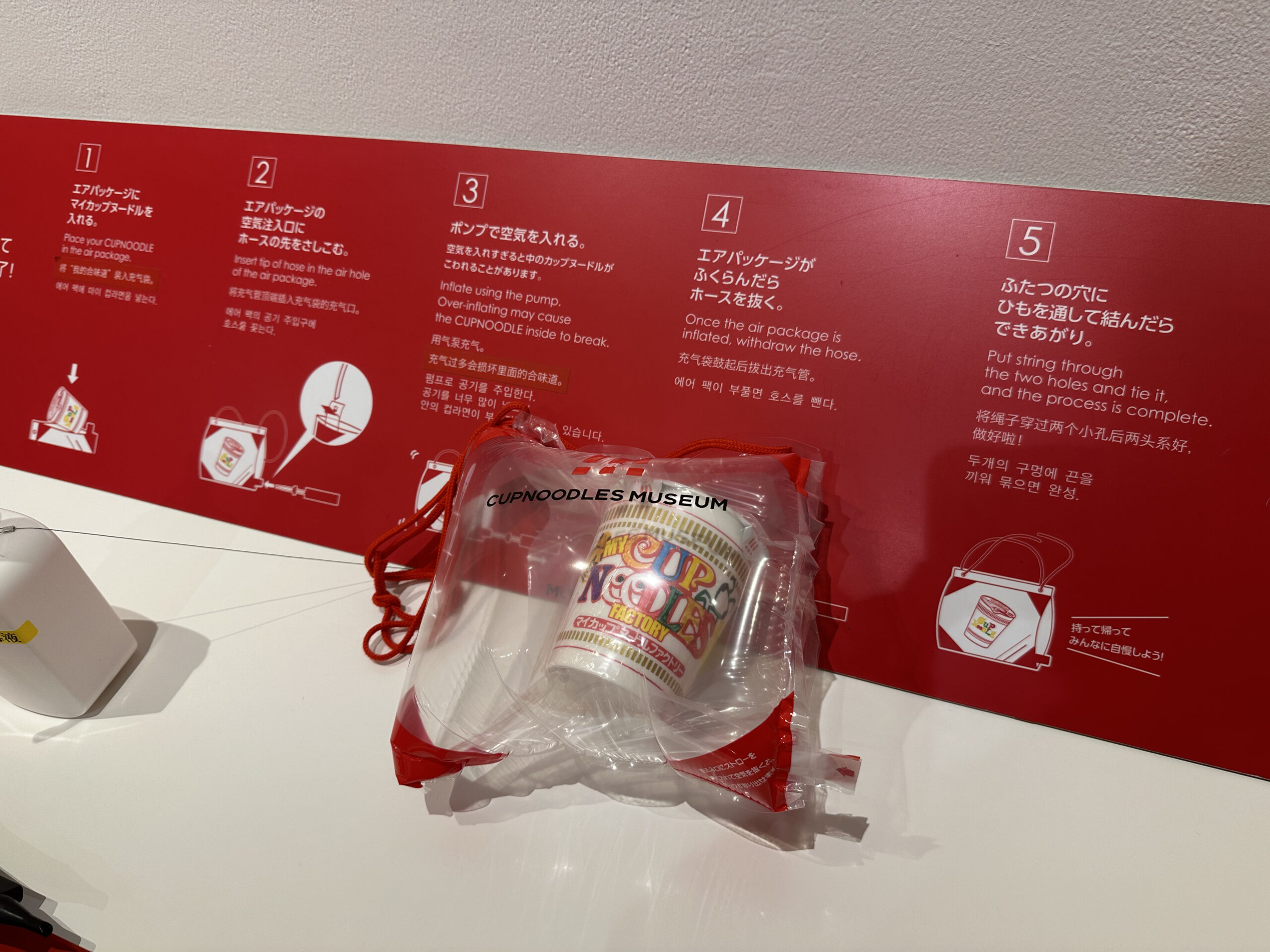 カップヌードルは、空気を入れて膨らませるおしゃれな袋に入れて持ち帰ることができます。